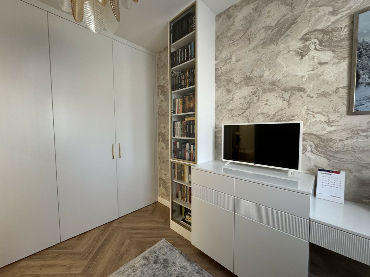 Całość mieszkania wyposażona w wysokiej jakości zabudowy meblowe wykonane na zamówienie pozostają na wyposażeniu.