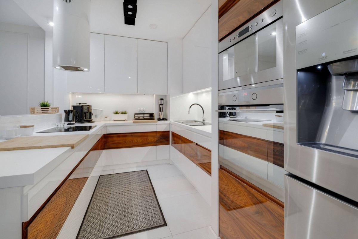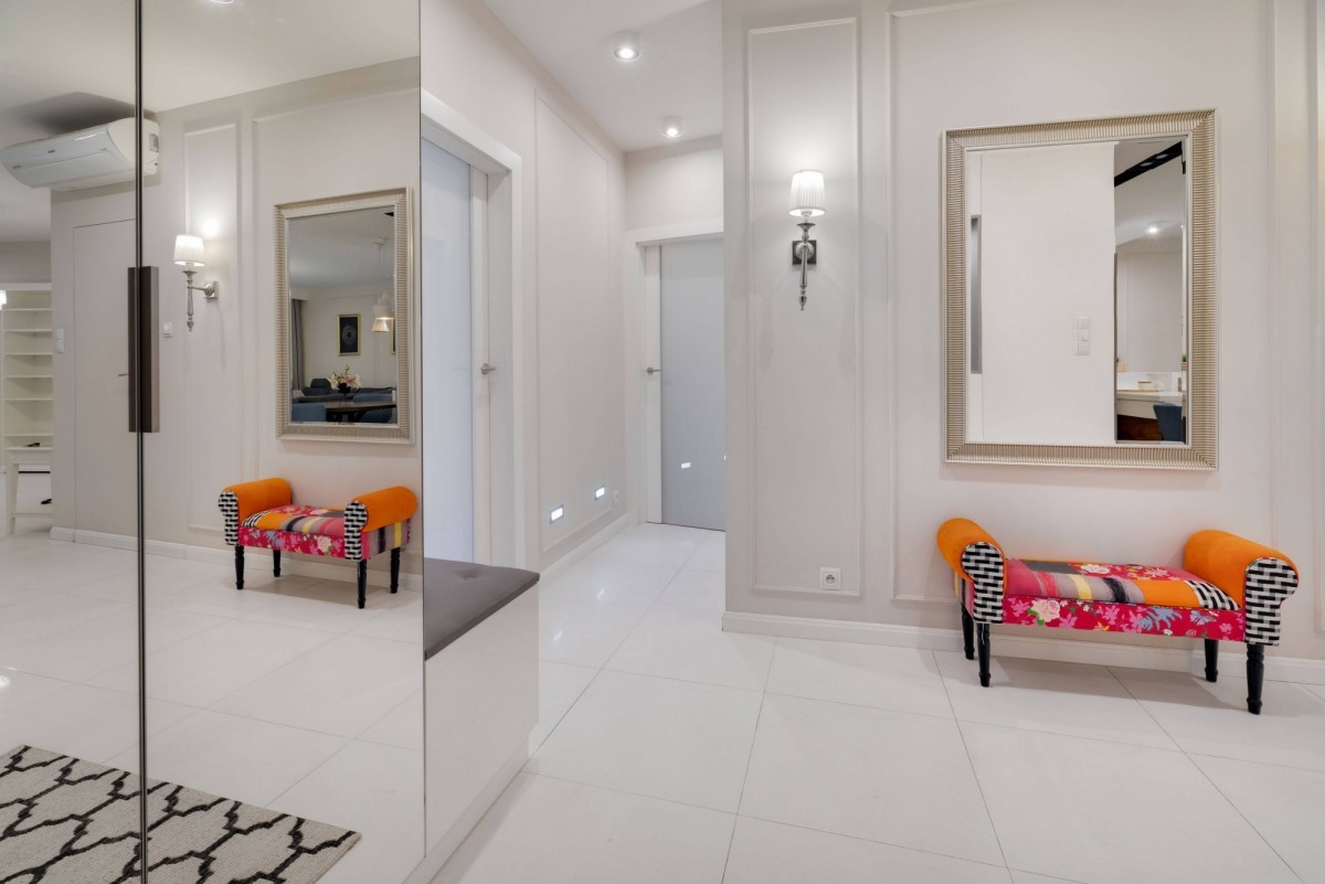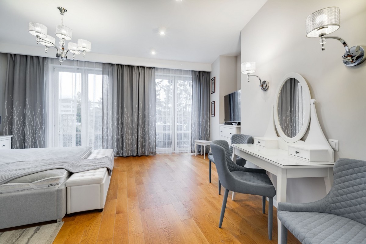 Przestronna kuchnia z wysokiej klasy sprzętem AGD, salon z częścią jadalnianą i wypoczynkową. Łazienka z prysznicem, wolnostojącą wanną i dużą ilością miejsca do przechowywania. Wnętrza w bieli i szarości, z przestronną szafą w hallu. Eleganckie oświetlenie, klimatyzacja w salonie i sypialni, podgrzewana podłoga w całym mieszkaniu.