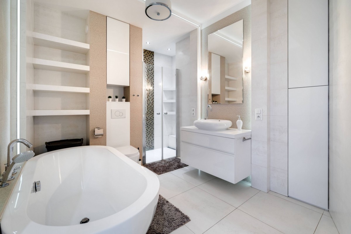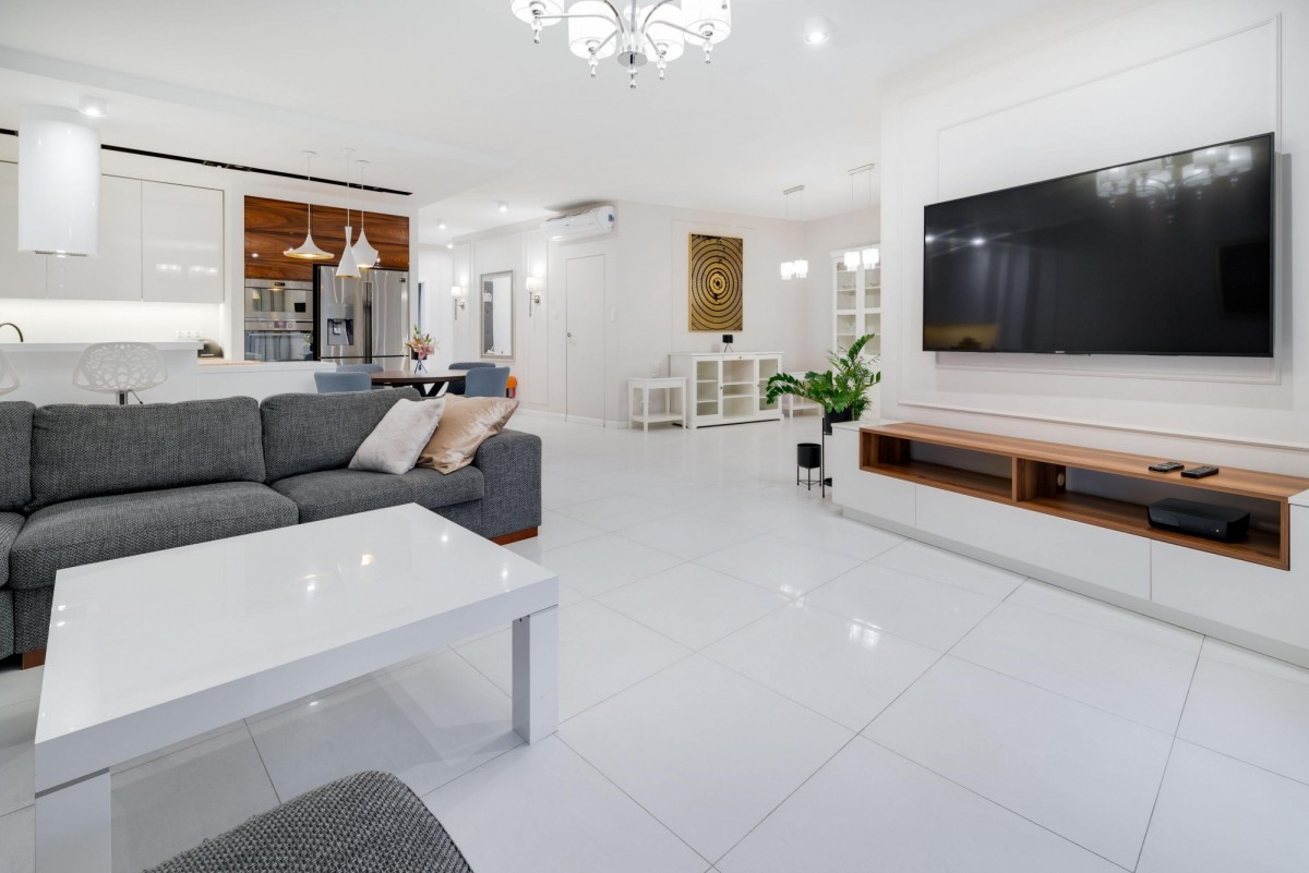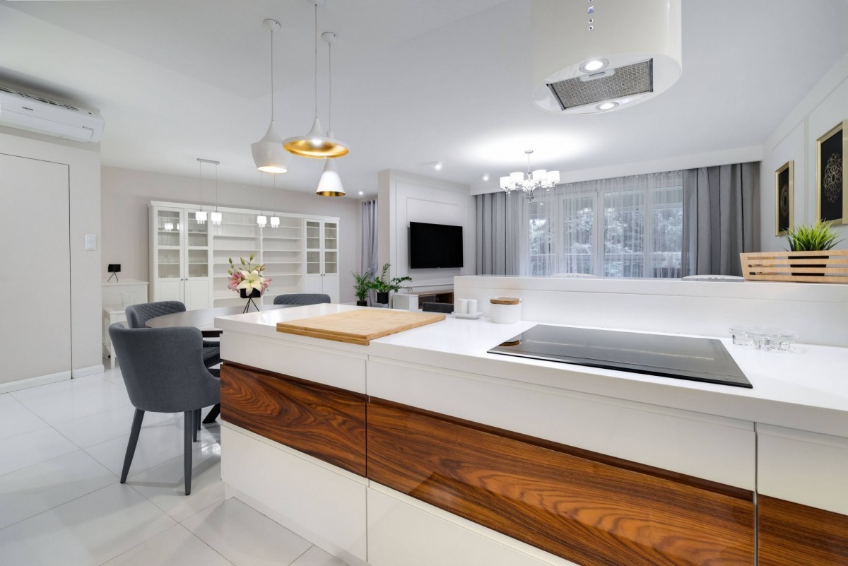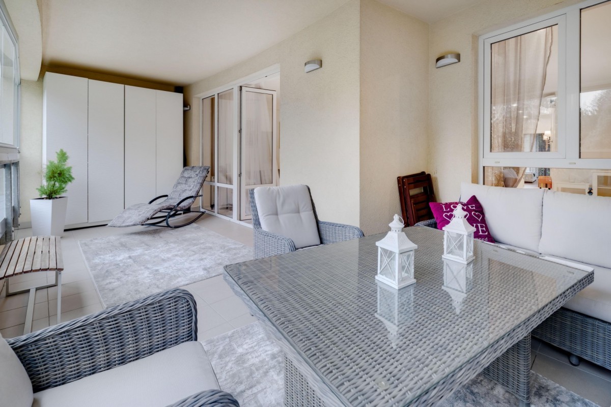 Przestronna kuchnia z wysokiej klasy sprzętem AGD, salon z częścią jadalnianą i wypoczynkową. Łazienka z prysznicem, wolnostojącą wanną i dużą ilością miejsca do przechowywania. Wnętrza w bieli i szarości, z przestronną szafą w hallu. Eleganckie oświetlenie, klimatyzacja w salonie i sypialni, podgrzewana podłoga w całym mieszkaniu.