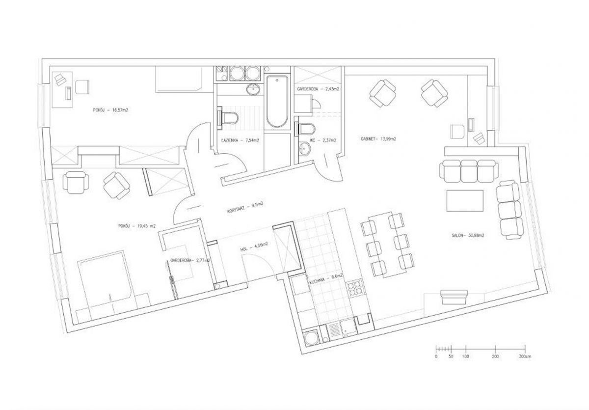 W mieszkaniu o powierzchni 121 m2 znajduje się: