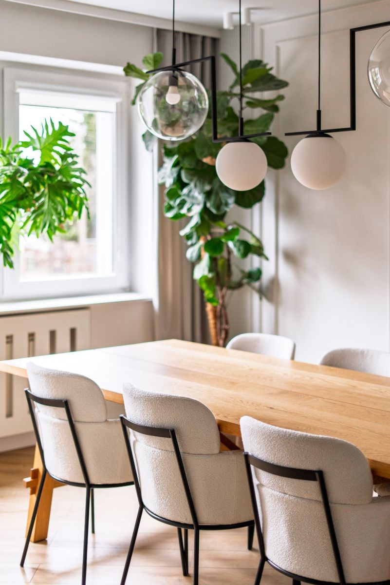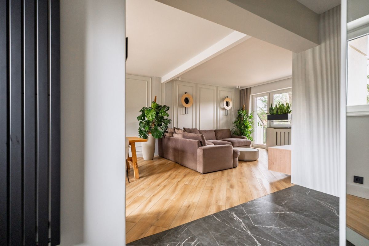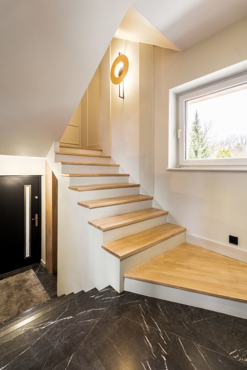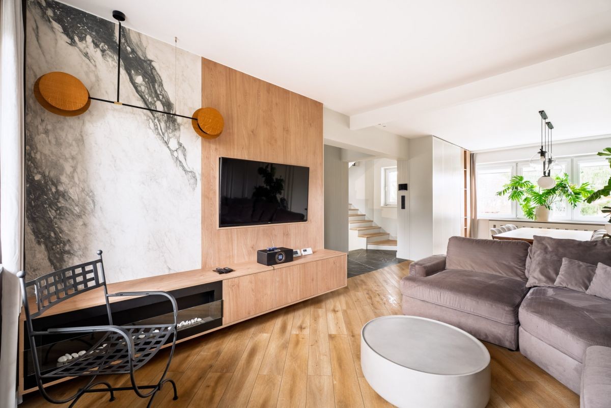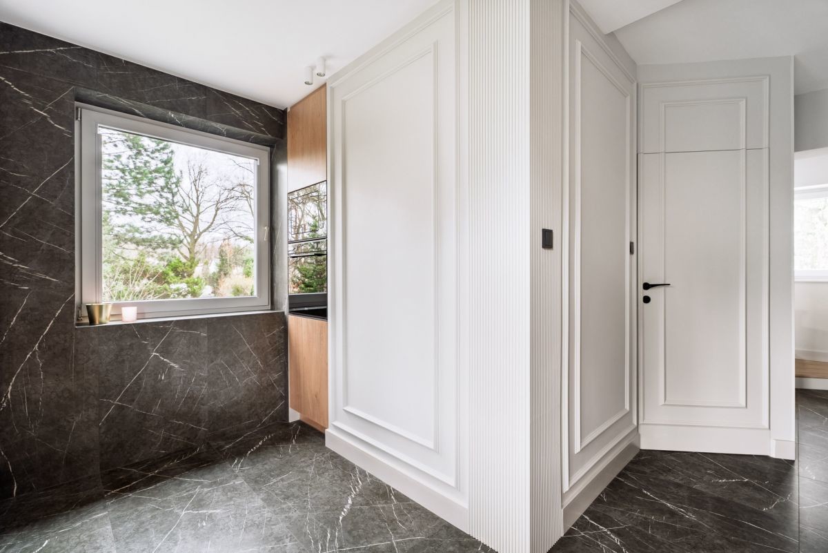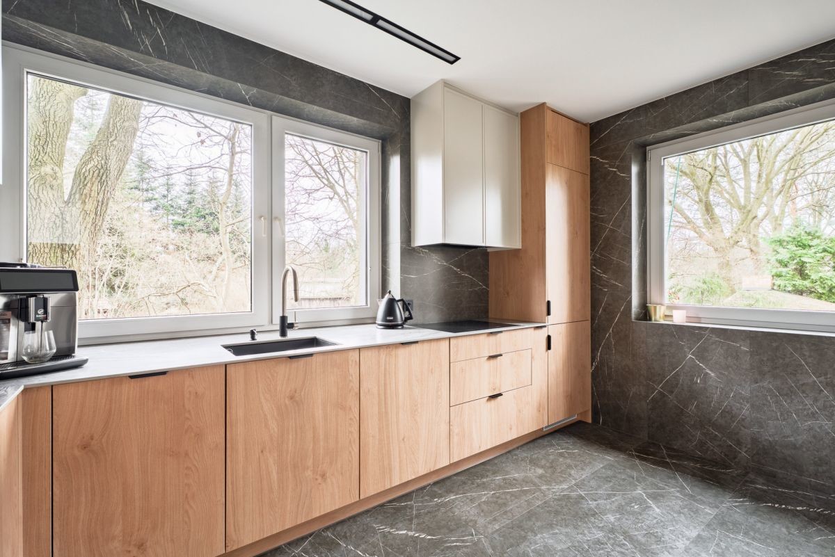 Na podłogach panele winylowe i gres wielkoformatowy. W kuchni blat kamienny. Drzwi wewnętrzne z krytymi zawiasami i zamkami magnetycznymi. Schody z dębu.