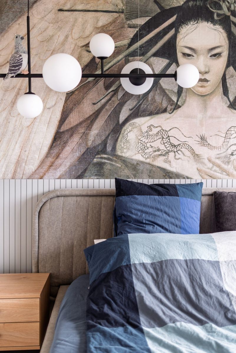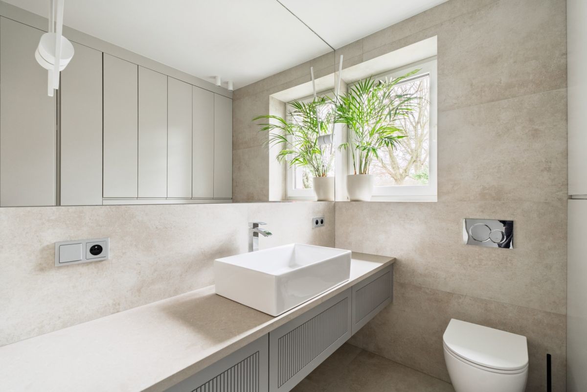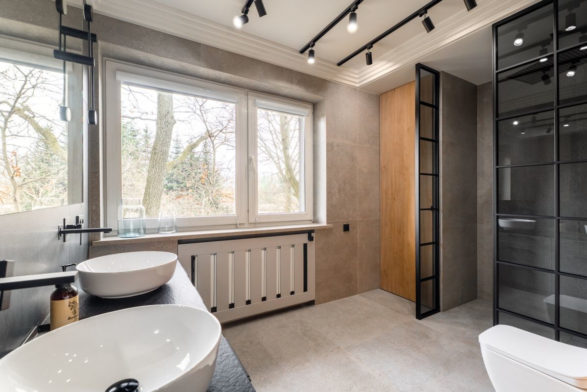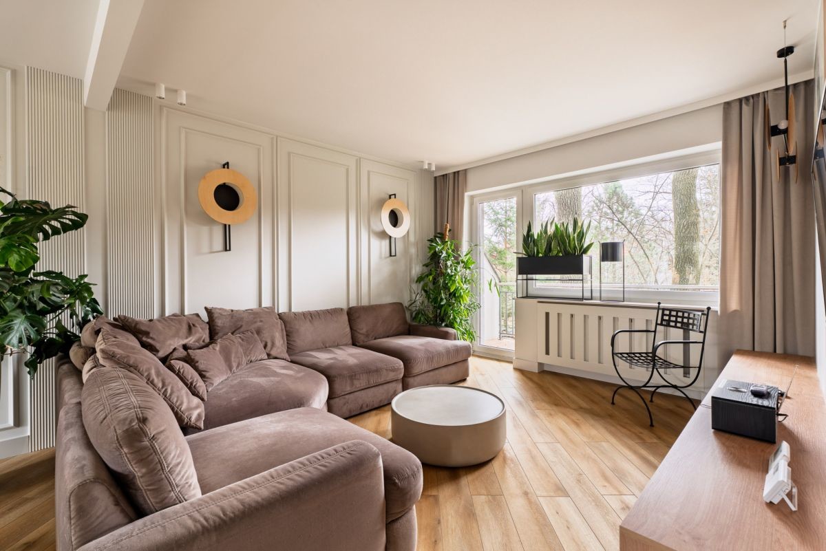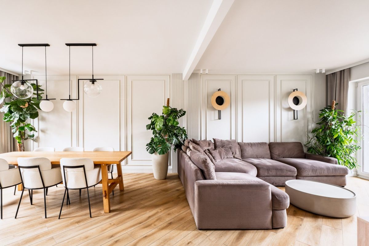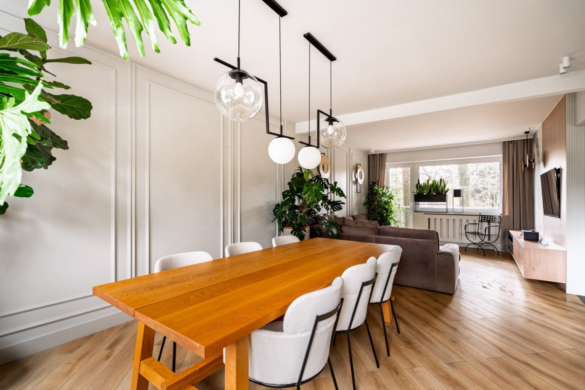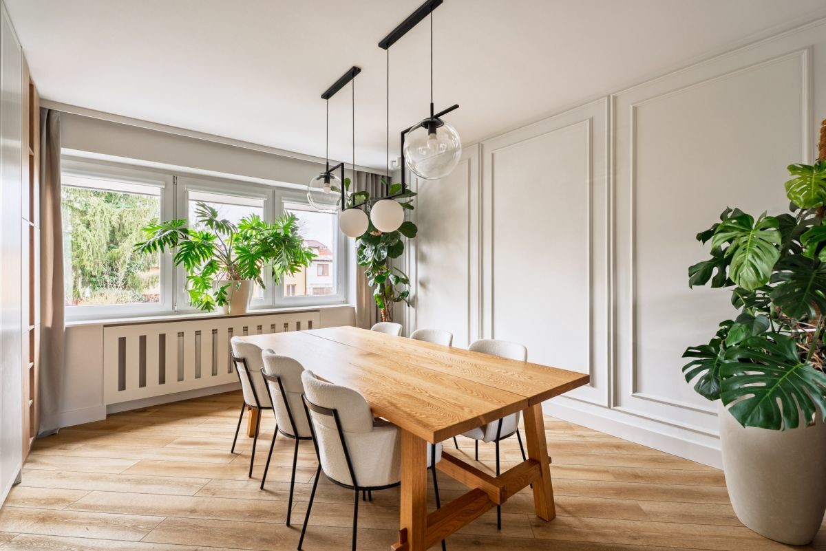 Na podłogach panele winylowe i gres wielkoformatowy. W kuchni blat kamienny. Drzwi wewnętrzne z krytymi zawiasami i zamkami magnetycznymi. Schody z dębu.