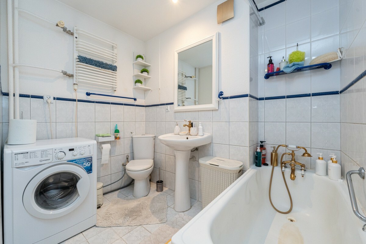 Łazienka wyposażona w wannę, umywalkę, pralkę oraz WC.