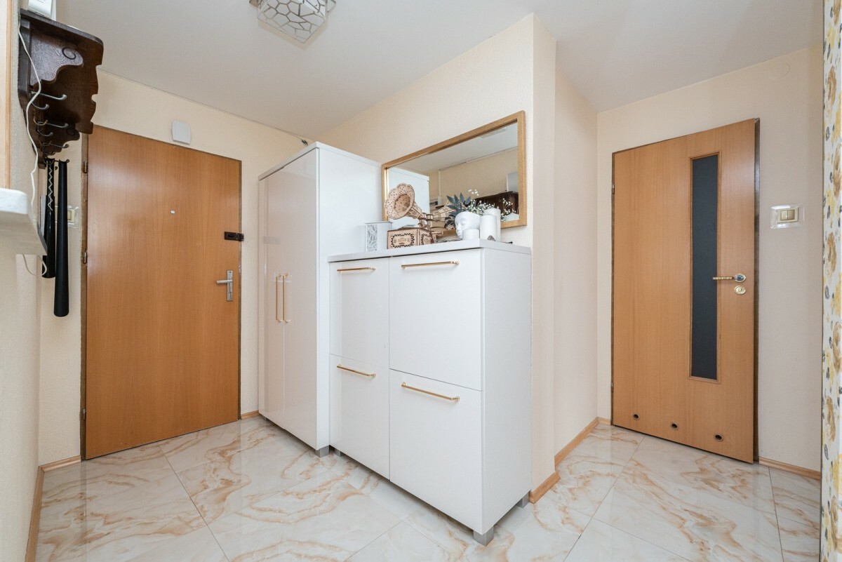 Przedpokój łączy wszystkie pozostałe pomieszczenia, obecnie znajdują się w nim szafy wolnostojące, w których miejsce można wstawić zabudowę.