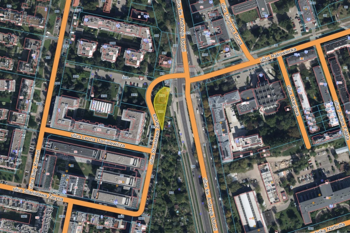 Działka jest ogrodzona siatką, a od strony ul. Stanisława Żaryna znajduje się sześć prywatnych stanowisk parkingowych, częściowo mieszczących się na terenie działki geodezyjnej.