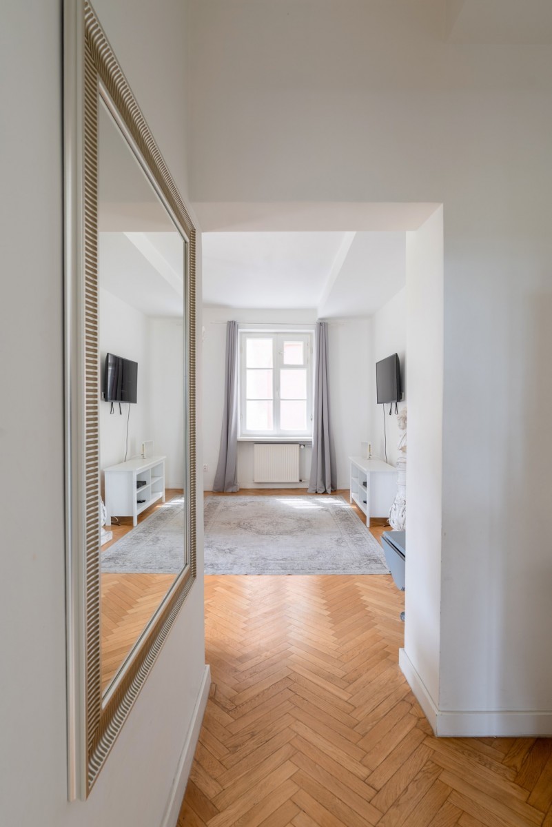 Mieszkanie idealne dla singla bez dzieci lub pary, która ceni bliskość tętniącego życiem miasta, jednak rozkład pomieszczeń pozwala na przystosowanie lokalu do prowadzenia firmy (np. kancelarii notarialnej, podatkowej itp).