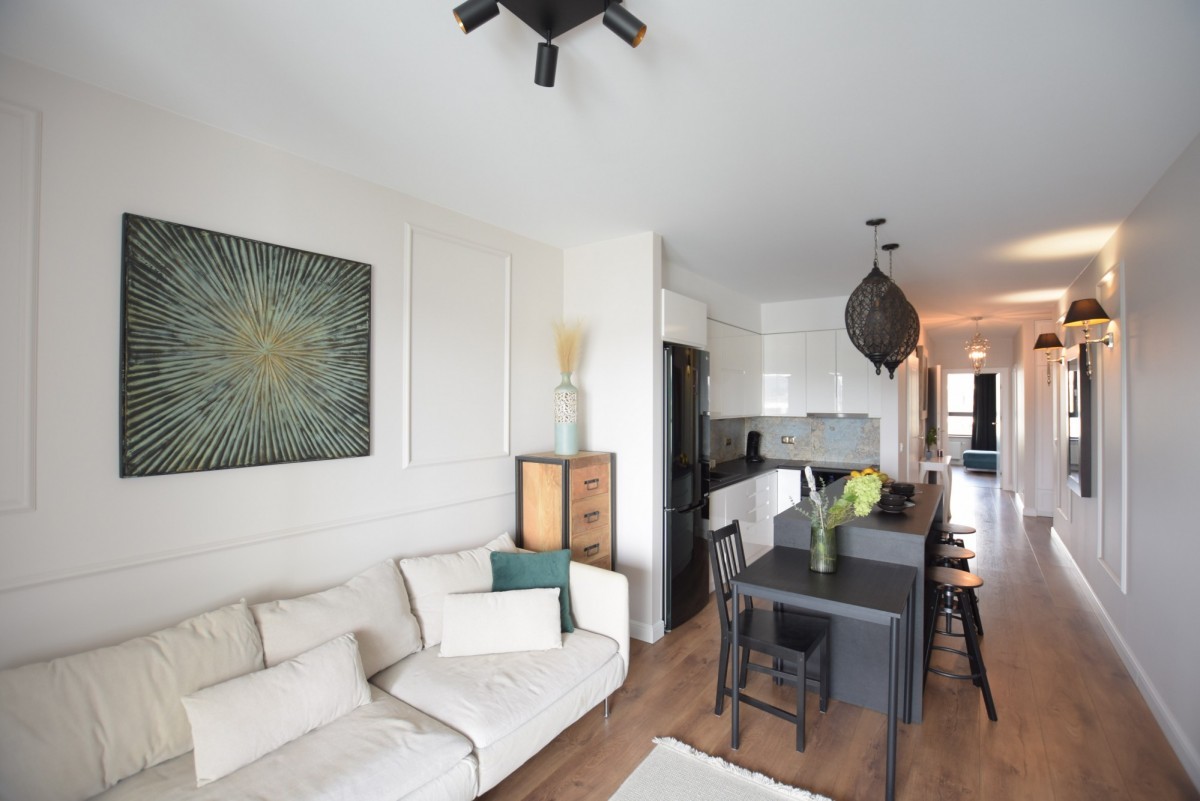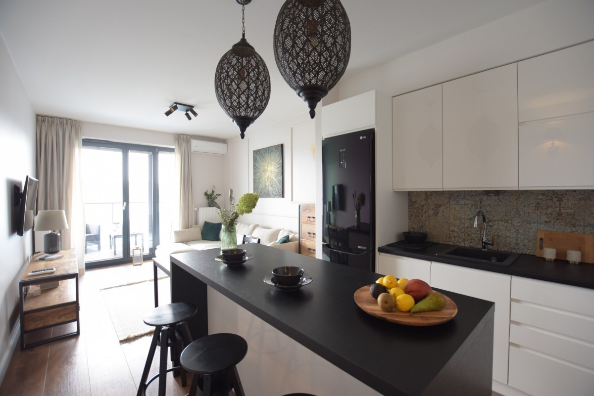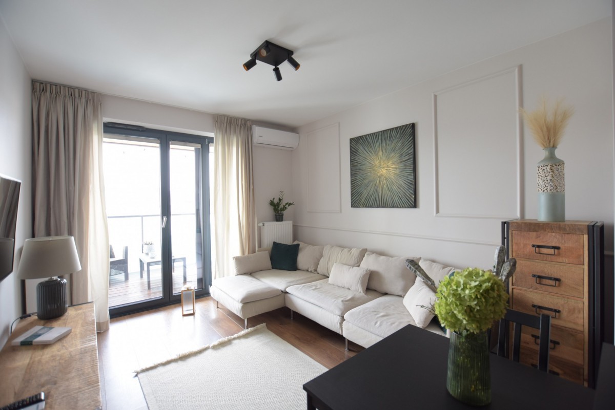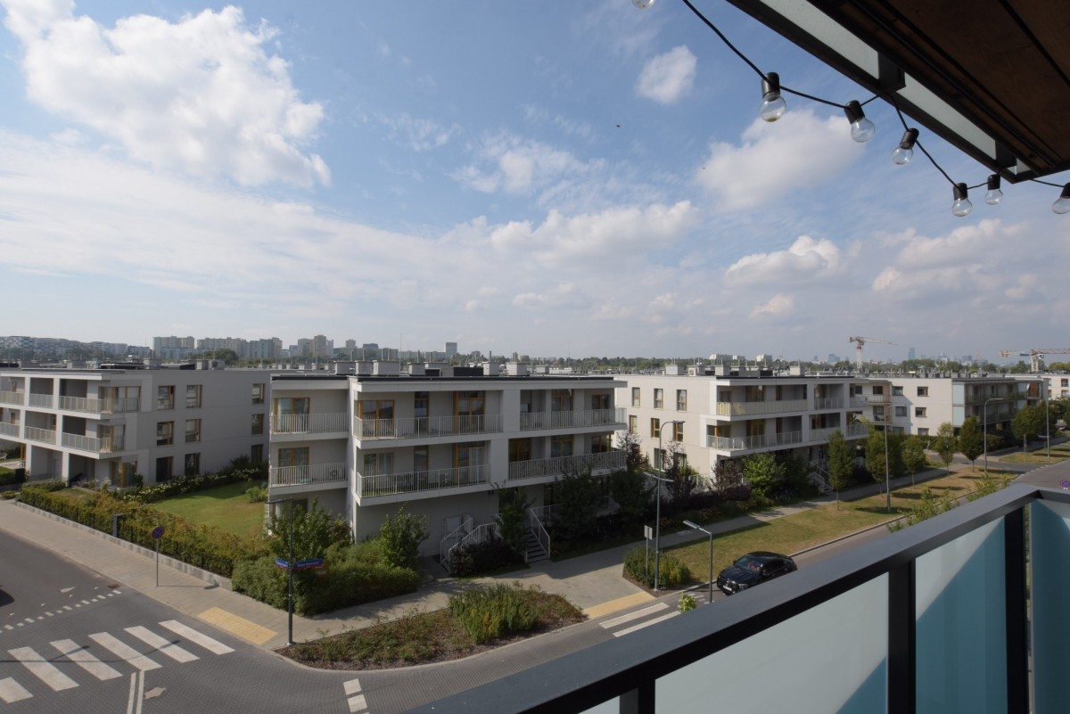 Atrakcyjne 3 pokoje, w pełni wyposażona kuchnia, taras z widokiem na panoramę Warszawy gwarantujący relaks i piękne widoki.
