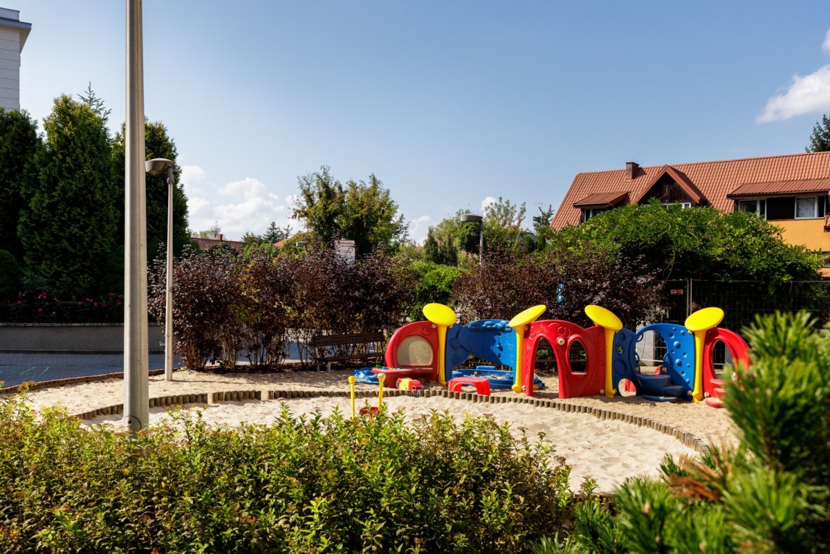 Osiedle to prawdziwa oaza spokoju: duże zielone patio, place zabaw, teren rekreacyjny, miejsce na grilla, całodobowa ochrona oraz garaż podziemny dla mieszkańców. To przestrzeń sprzyjająca relaksowi, aktywności na świeżym powietrzu i bezpiecznemu życiu rodzinnemu.