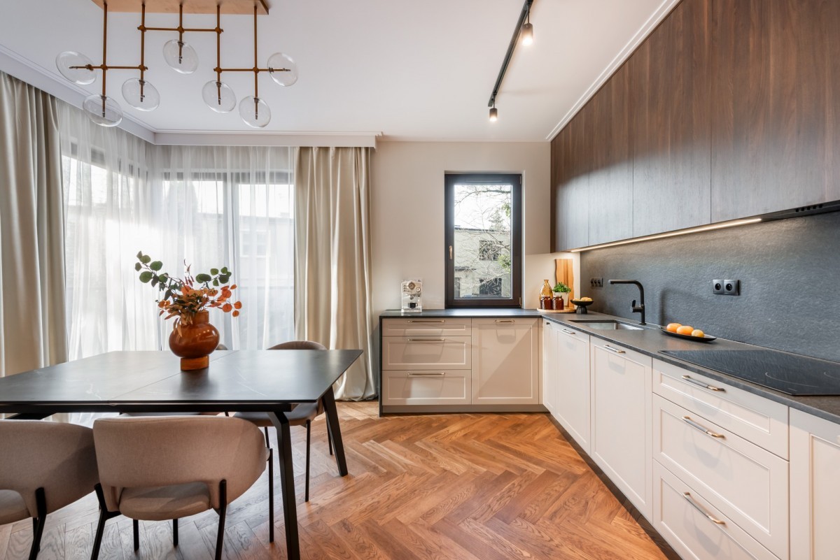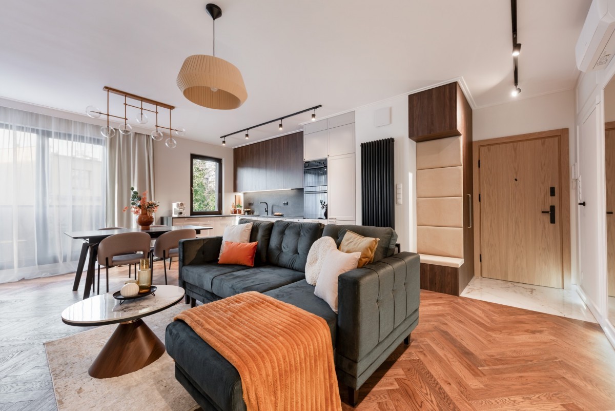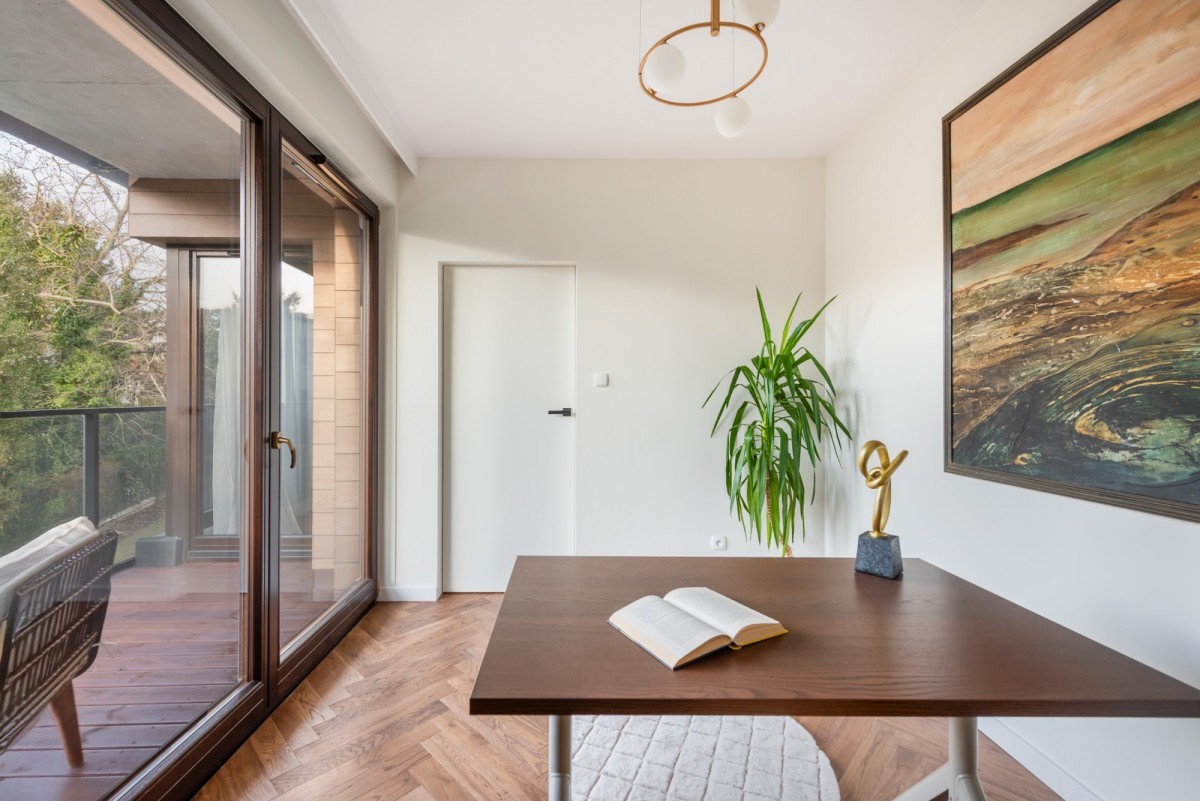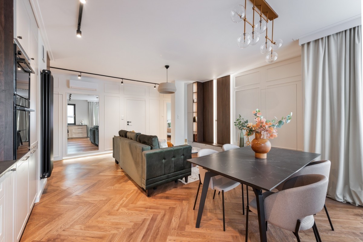 Wnętrze mieszkania wykończone zostało z wyjątkową starannością i dbałością o detale, przy użyciu materiałów najwyższej klasy. Na podłogach położono klejoną deskę dębową, która nadaje przestrzeni naturalnego ciepła i elegancji. Kuchnia oraz łazienki zostały wyposażone w blaty z litego granitu, a ściany w łazienkach wykończono sprowadzanymi z Hiszpanii płytkami, wyróżniającymi się unikalnym designem i wysoką jakością. Wszystkie meble zostały wykonane na zamówienie - w całości lakierowane, co podkreśla spójność i luksusowy charakter wnętrza. Całość uzupełniają drzwi wewnętrzne renomowanej firmy DRE, a także dwie jednostki klimatyzacji, zapewniające komfort niezależnie od pory roku.
