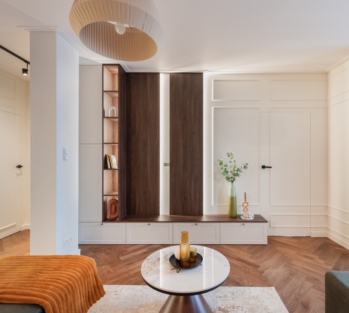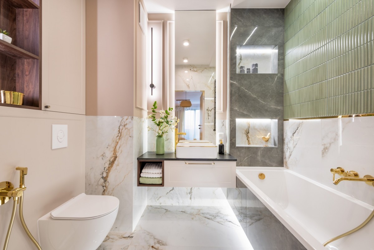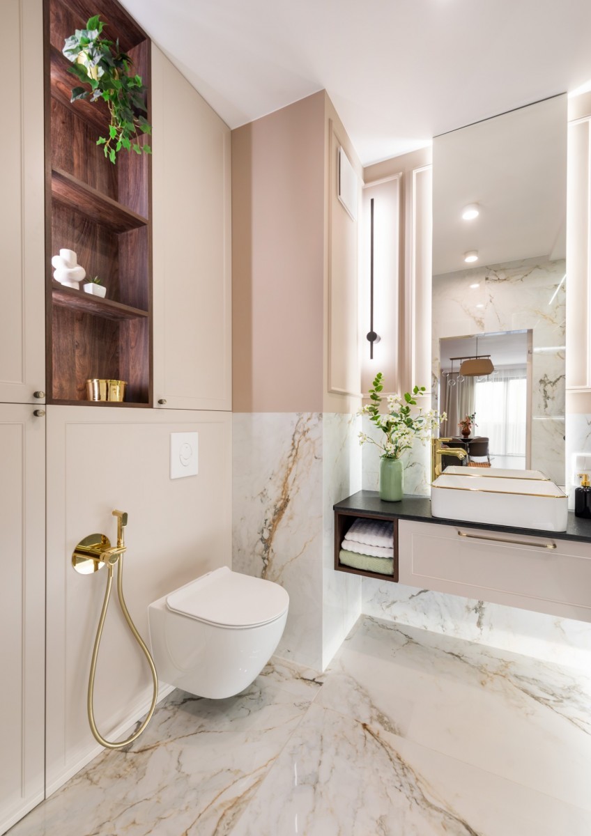 Wnętrze mieszkania wykończone zostało z wyjątkową starannością i dbałością o detale, przy użyciu materiałów najwyższej klasy. Na podłogach położono klejoną deskę dębową, która nadaje przestrzeni naturalnego ciepła i elegancji. Kuchnia oraz łazienki zostały wyposażone w blaty z litego granitu, a ściany w łazienkach wykończono sprowadzanymi z Hiszpanii płytkami, wyróżniającymi się unikalnym designem i wysoką jakością. Wszystkie meble zostały wykonane na zamówienie - w całości lakierowane, co podkreśla spójność i luksusowy charakter wnętrza. Całość uzupełniają drzwi wewnętrzne renomowanej firmy DRE, a także dwie jednostki klimatyzacji, zapewniające komfort niezależnie od pory roku.