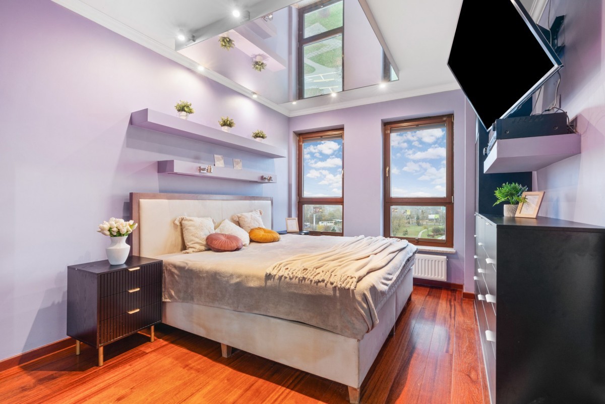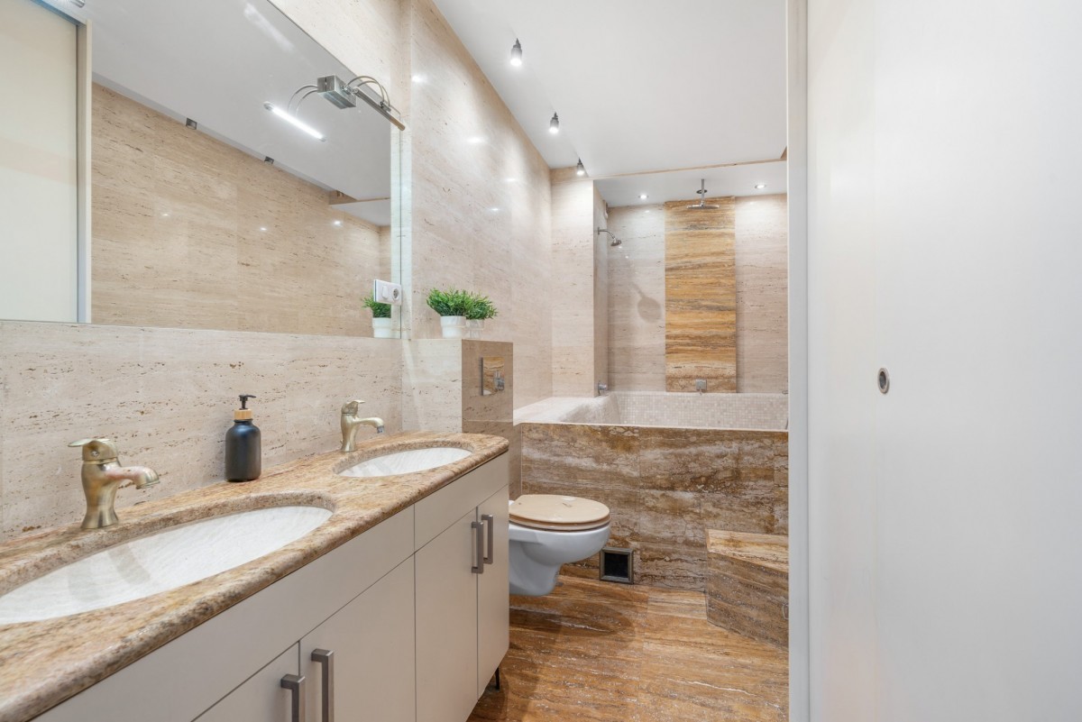 Wykończenie wnętrz zostało wykonane z dbałością o każdy detal - naturalny kamień, drewno, włoskie płytki, armatura premium. Mieszkanie narożne, doskonale doświetlone, z ekspozycją na dwie strony świata.