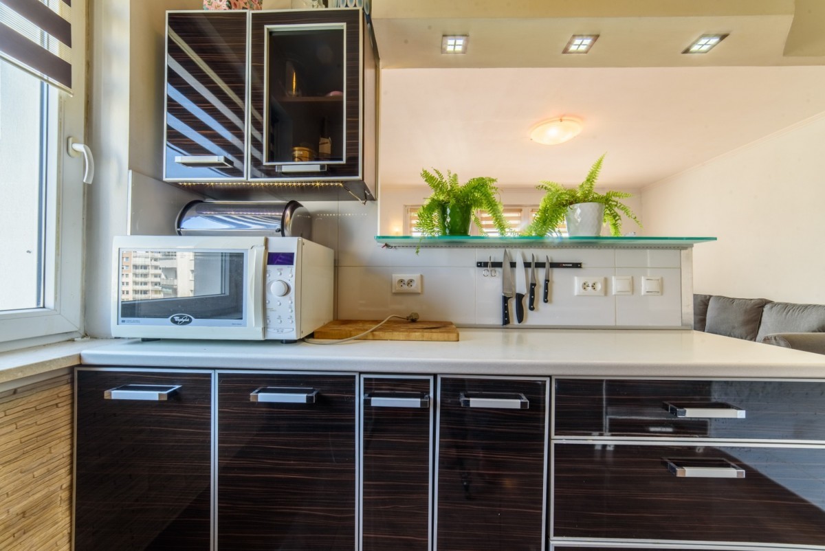 Loggia o powierzchni około 6 m2 została całkowicie zabudowana dzięki czemu uzyskano dodatkowe pomieszczenie do relaksu. Loggia wyposażona w kominek elektryczny i przy zamkniętych oknach stanowi idealne miejsce na zimowy odpoczynek. Latem i w ciepłe dni można otworzyć okna.