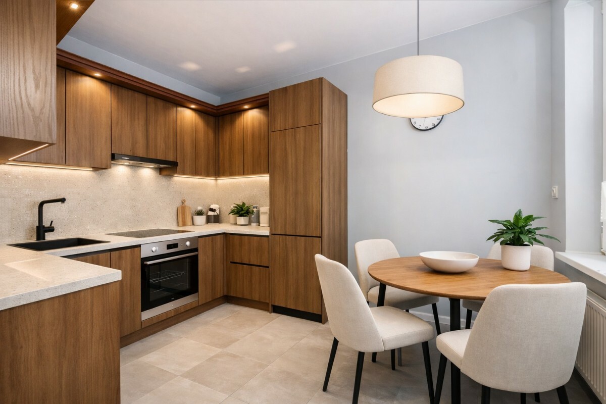 * Kuchnia stanowi osobne pomieszczenie i jest w pełni wyposażona w niezbędny sprzęt AGD, w tym lodówkę z zamrażarką, piekarnik, płytę grzewczą oraz zmywarkę.