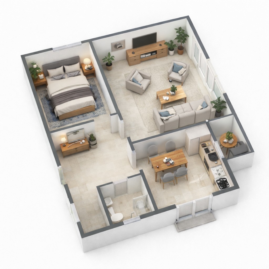 Wnętrze utrzymane w nowoczesnym stylu. Pokoje nie są umeblowane, co daje pełną swobodę aranżacji według własnego gustu. Jednocześnie kuchnia i łazienka są w 100% wyposażone — gotowe do użytkowania od pierwszego dnia. Kuchnia posiada sprzęt AGD: lodówkę, zmywarkę, piekarnik oraz pralkę z funkcją suszenia.