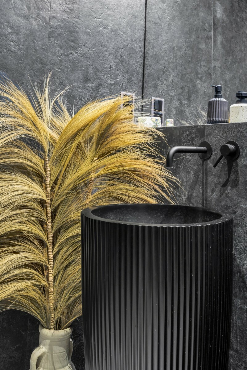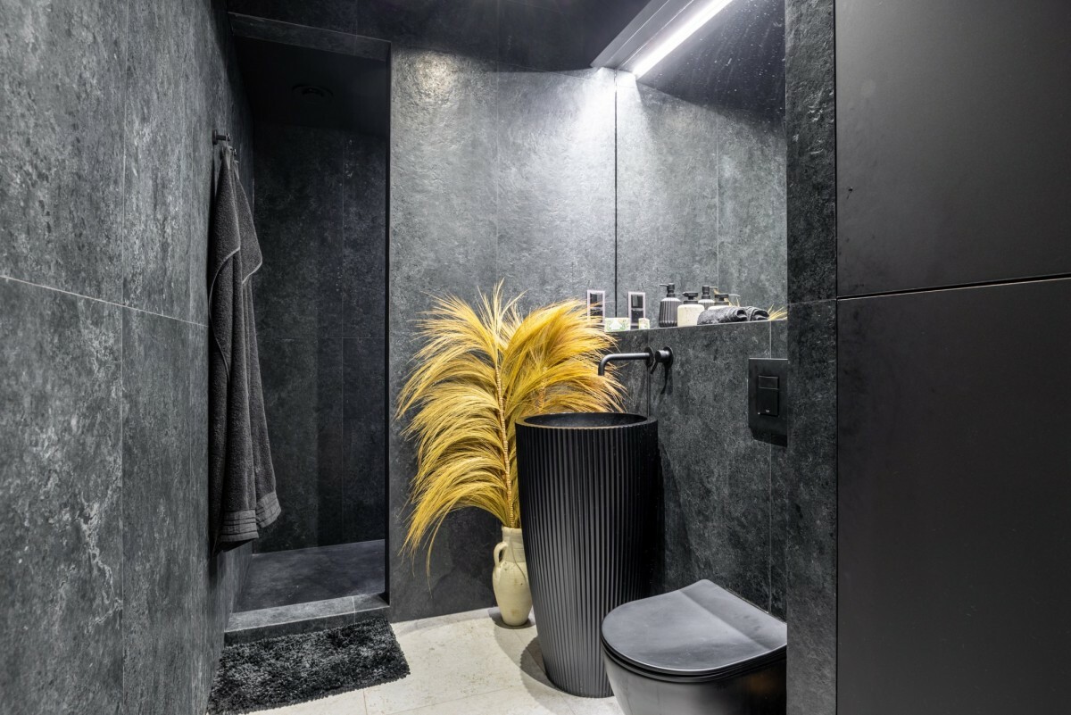 W łazience: włoska armatura, deszczownica podtynkowa 50x50, brodzik kamienny, umywalka wolnostojąca (odlew mineralny), duże lustro na wymiar, oświetlenie LED.