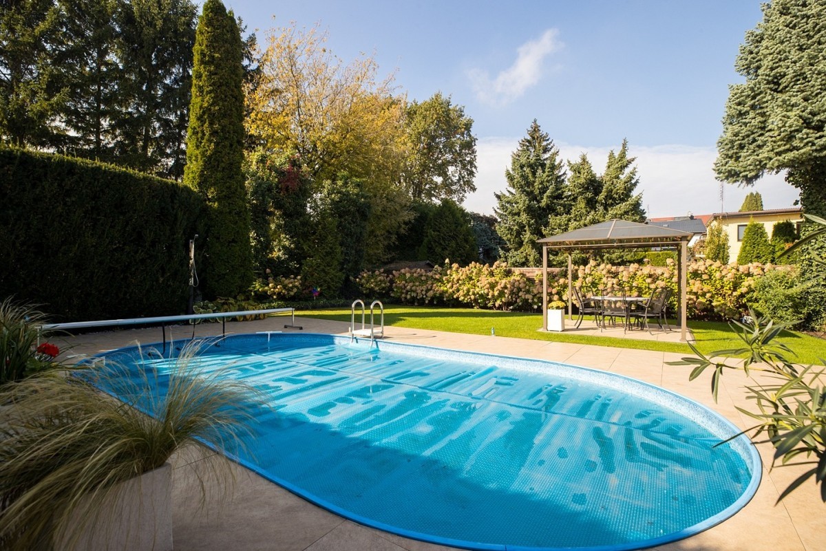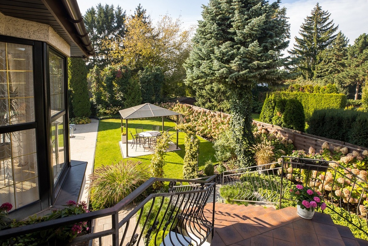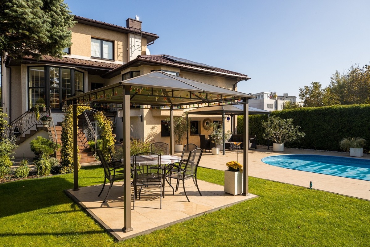 Starannie zaprojektowany ogród z basenem tworzy prywatną strefę wypoczynku - bez sąsiadów „zaglądających w okna”. To rzadkość w tej części Warszawy. Idealne miejsce na relaks, spotkania rodzinne i letnie przyjęcia.