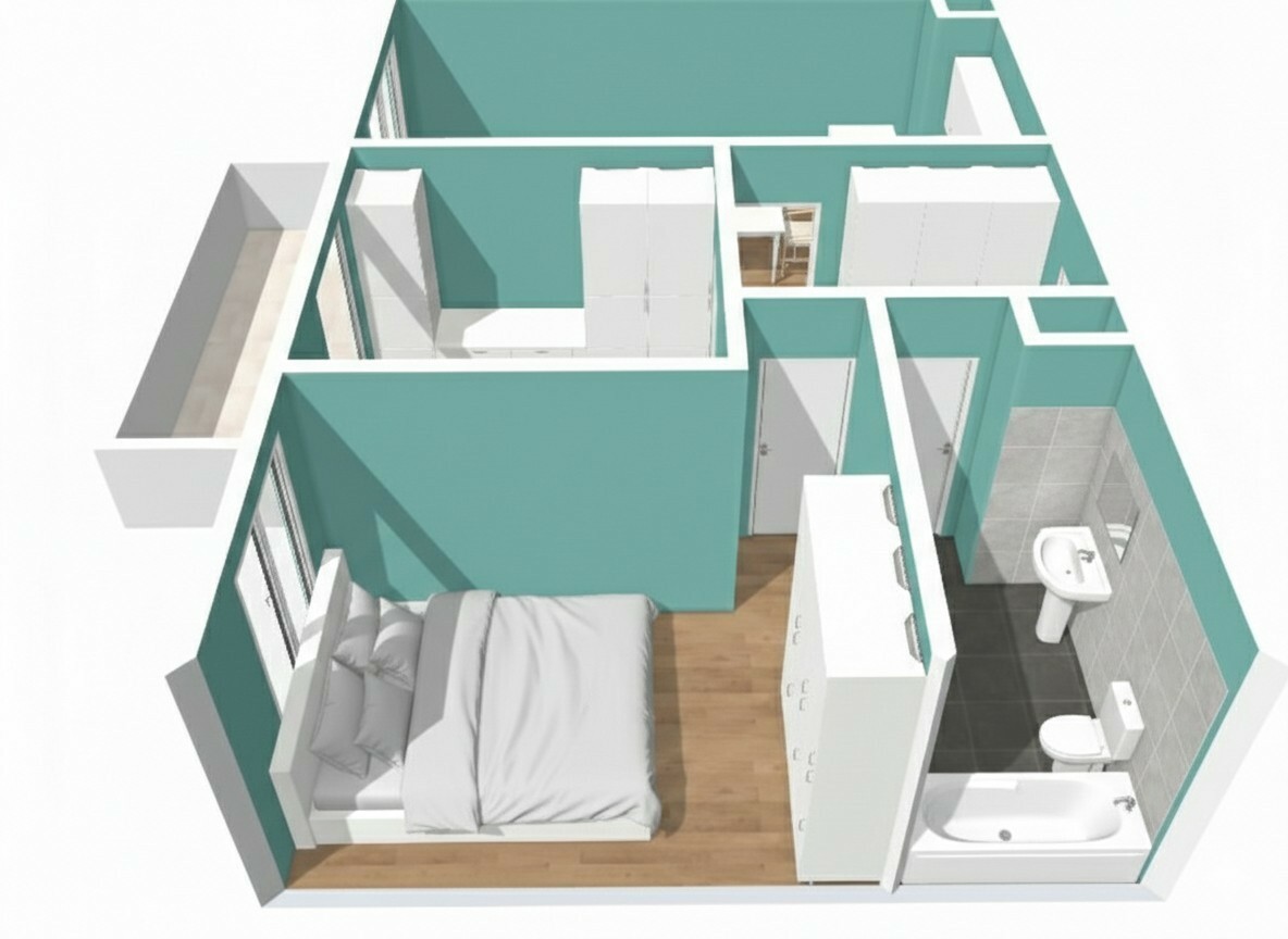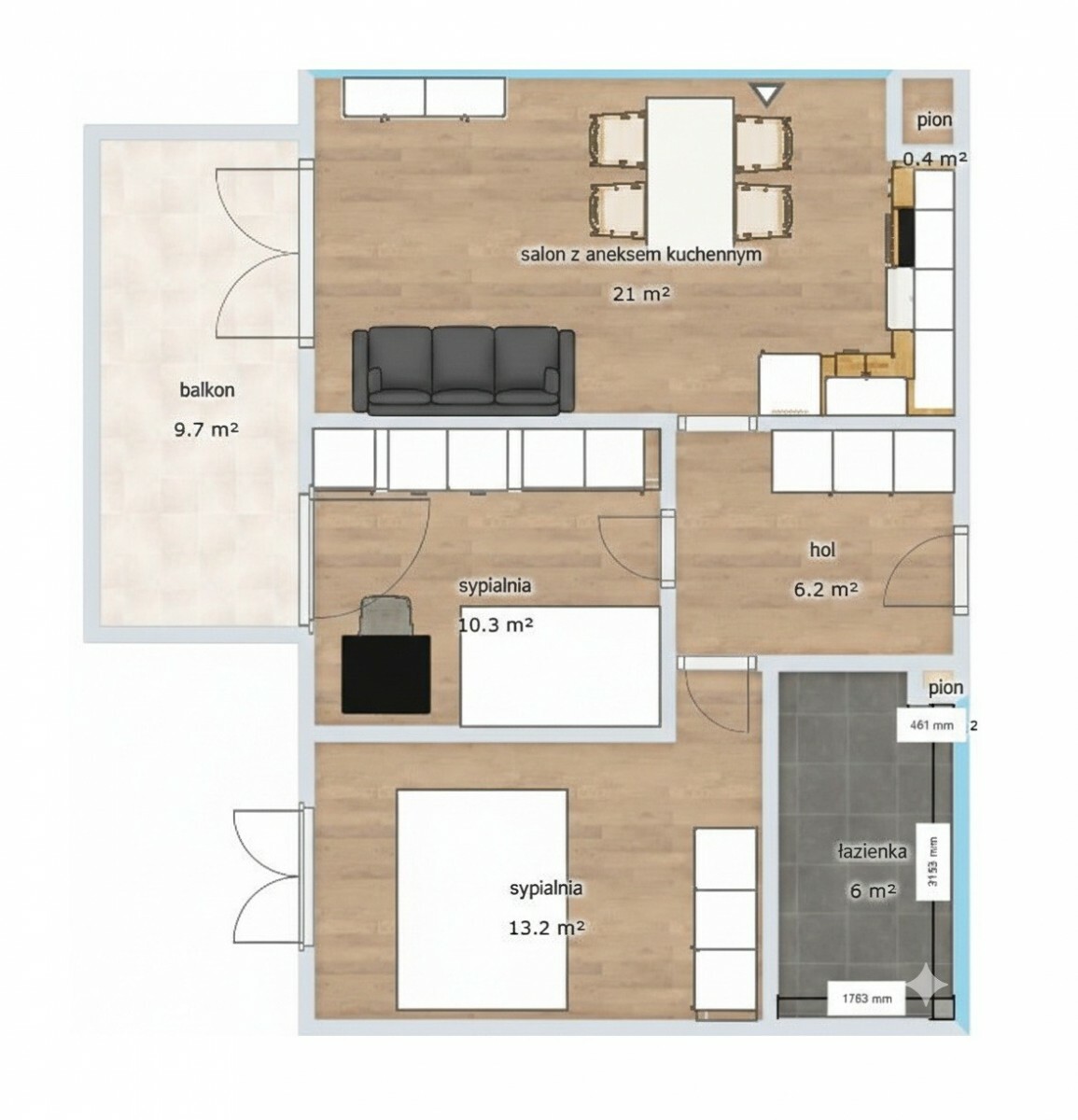 - dwie niezależne sypialnie (13,2 m² i 10,3 m²)