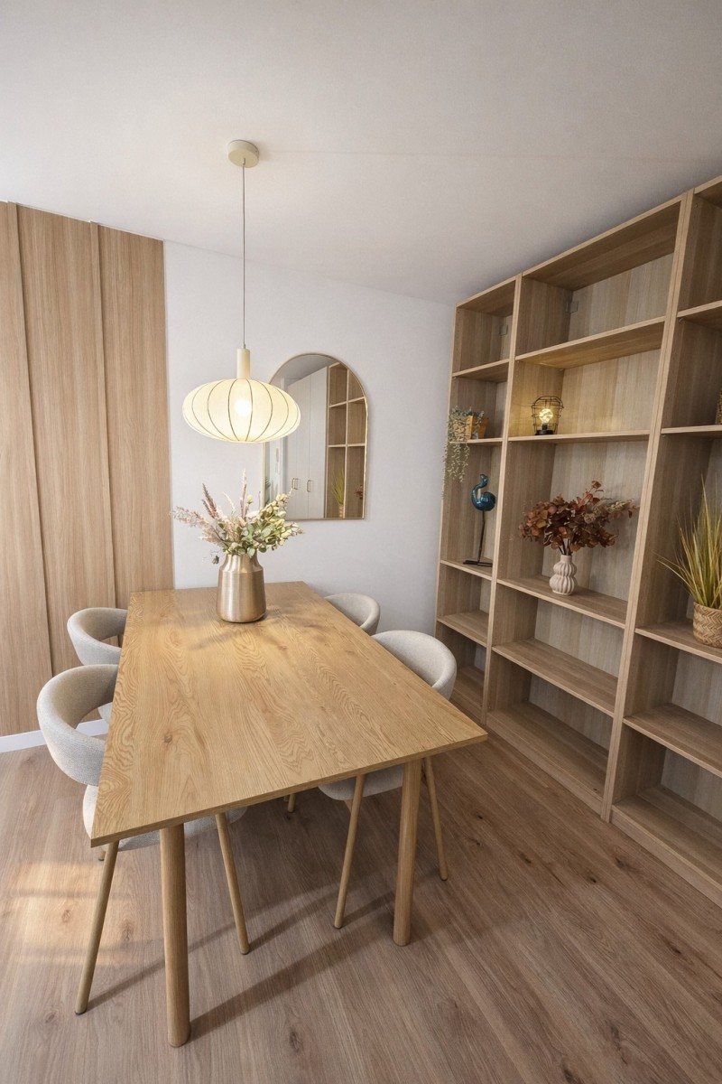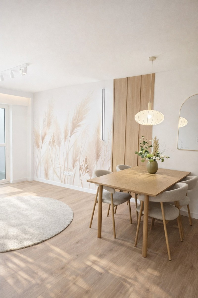 • duży salon z wyjściem na balkon z widokiem na piękne drzewo. W salonie jest strefa TV oraz strefa jadalna z dużym, wygodnym stołem oraz dużą ilością miejsca do przechowywania