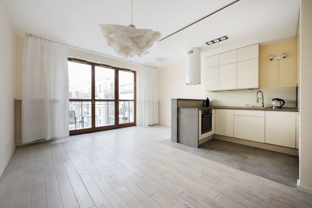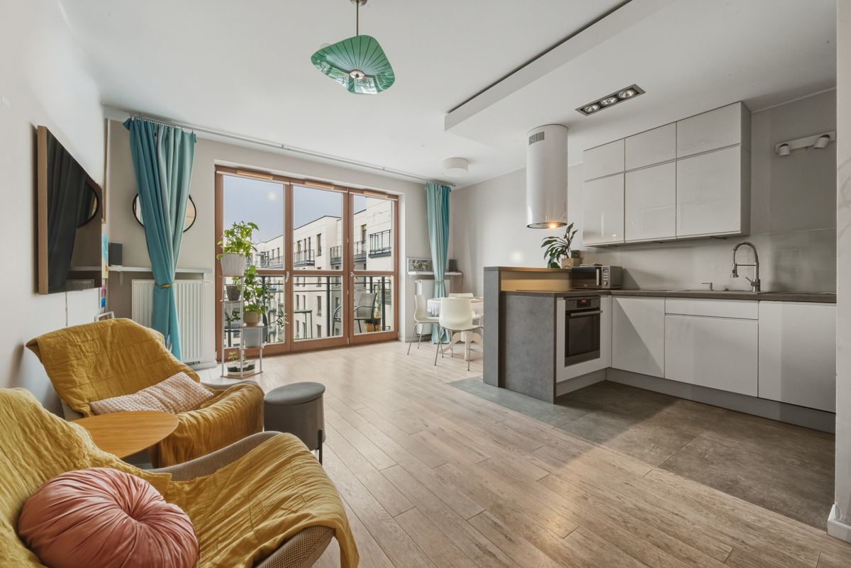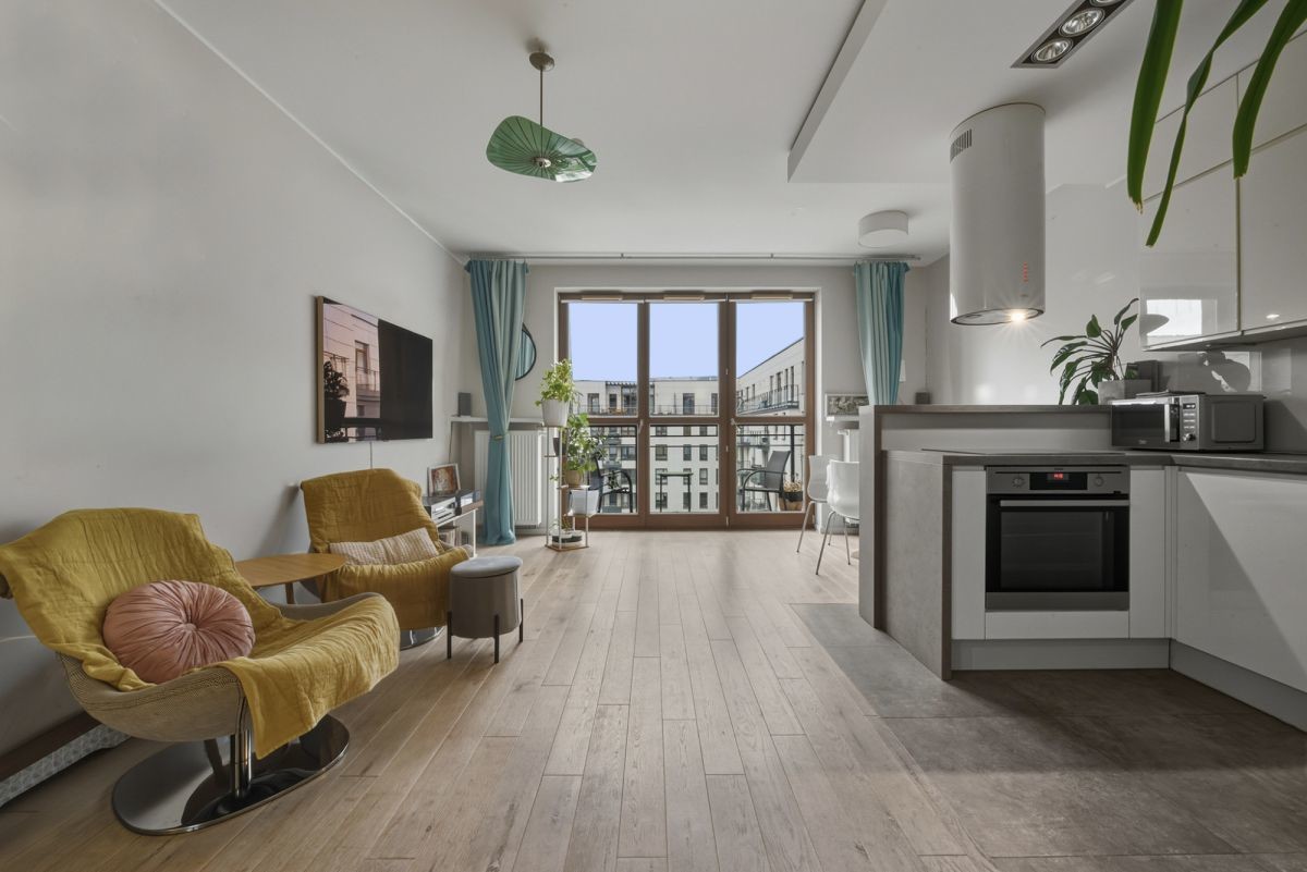 przestronny salon z aneksem kuchennym i wyjściem na balkon - 28,24m2