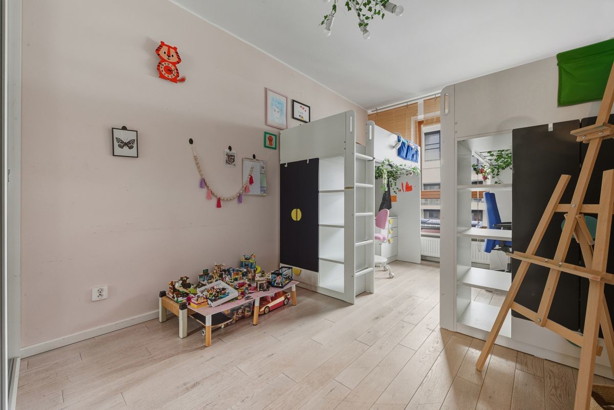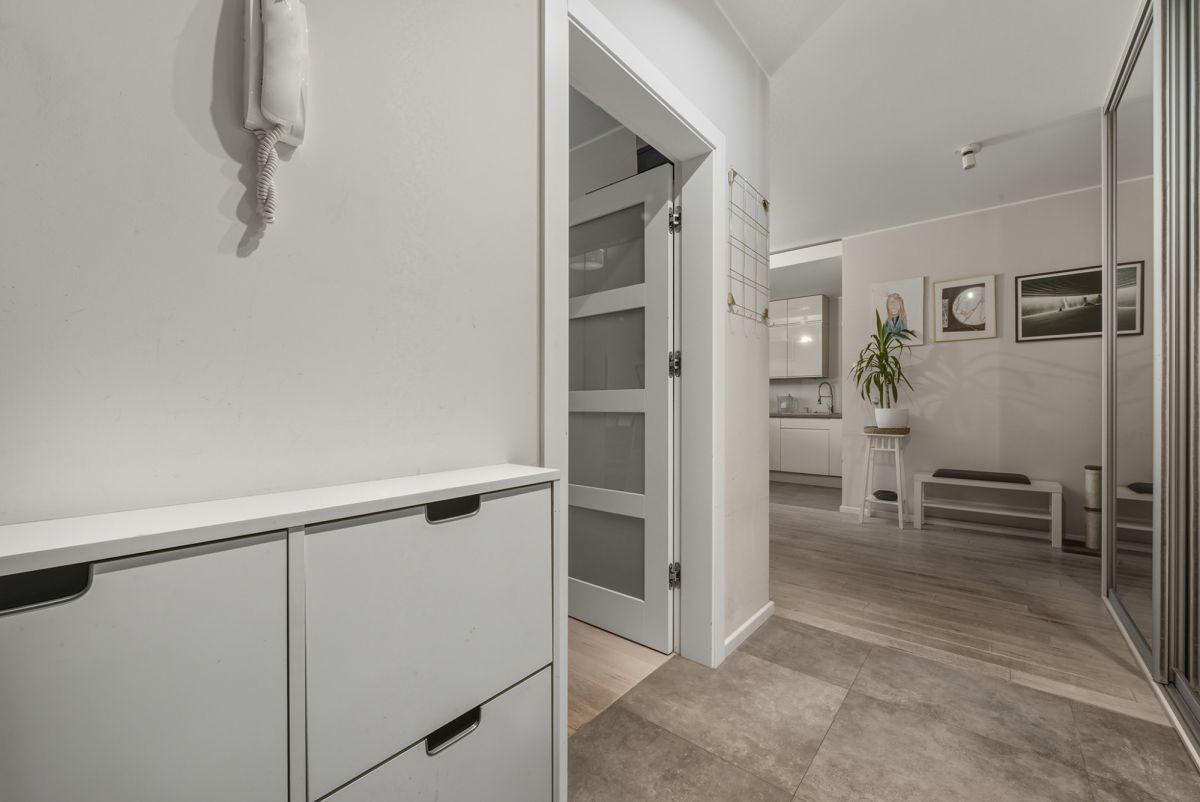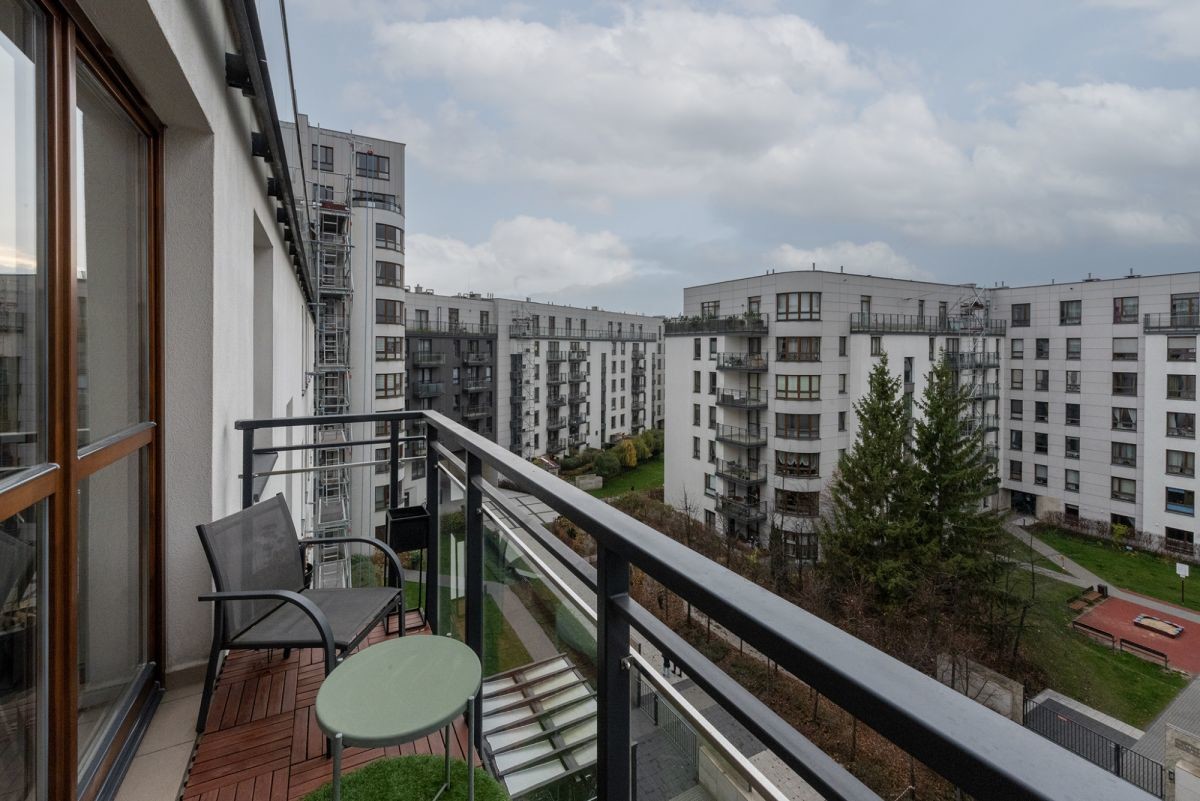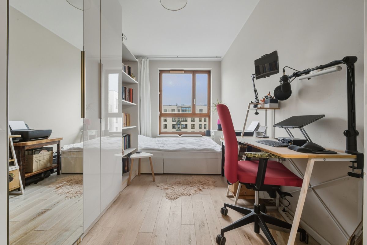 The apartment is situated on the 5th floor of a 6-story apartment building from 2014, in the intimate \"Atelier Żoliborz\" estate. The building is finished to a good standard, well-maintained, and secure - equipped with a modern elevator, monitoring, and security. Quiet and cozy - only 3 apartments per floor. Well-kept and nicely landscaped common areas and outdoor space between buildings. The apartment is very bright thanks to large windows with east/west exposure. The functional layout ensures comfort and privacy for residents.