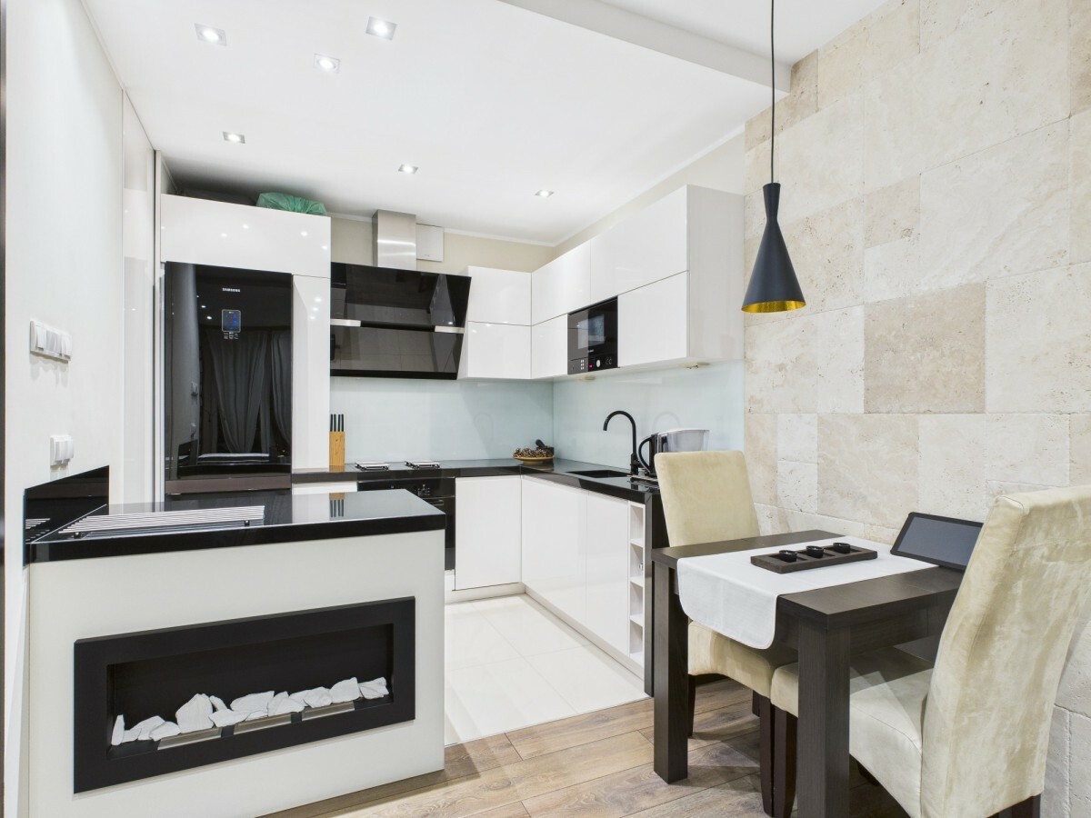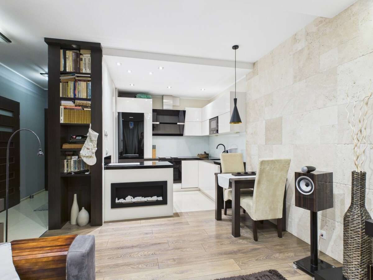 - salon z aneksem kuchennym i wyjściem na balkon