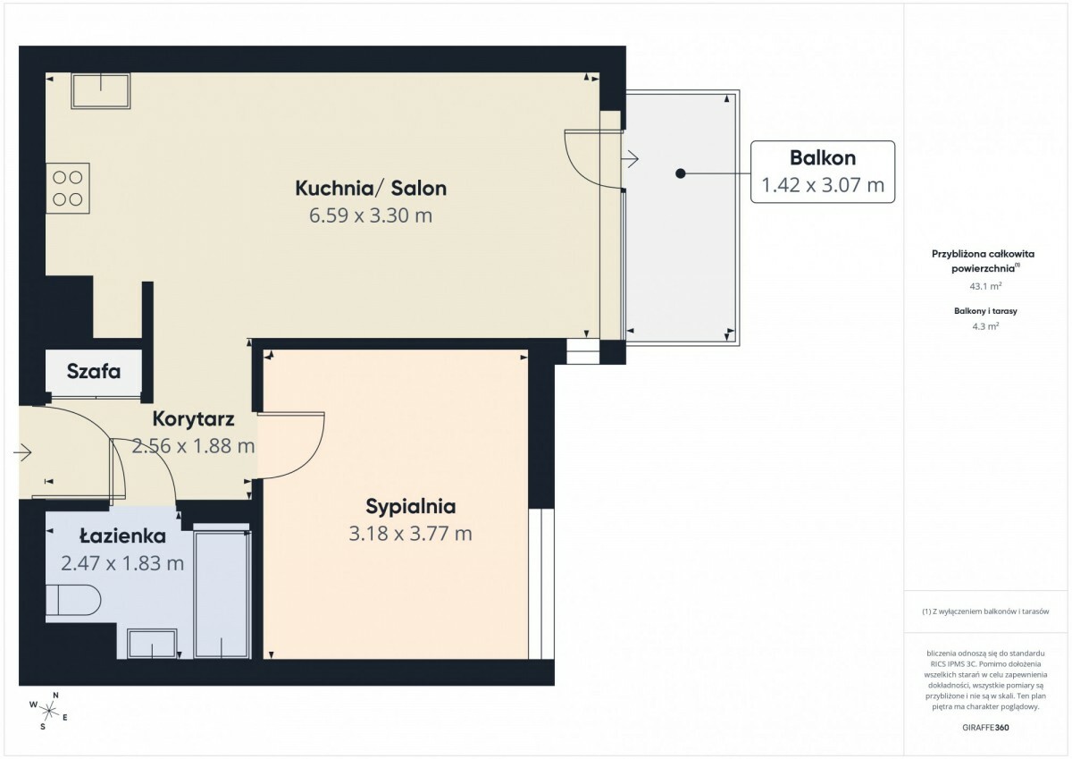 Liczba pokoi 2 (salon z aneksem 22m2 + sypialnia 12m2)