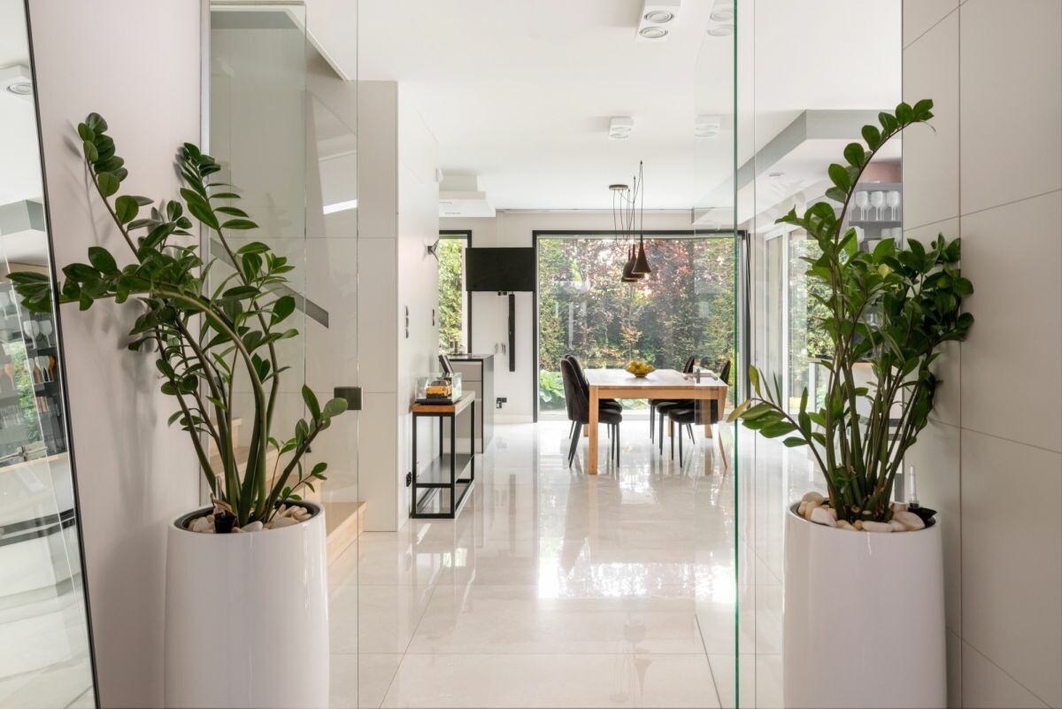 • Salon 90 m² z panoramicznymi drzwiami tarasowymi HS na całą ścianę
