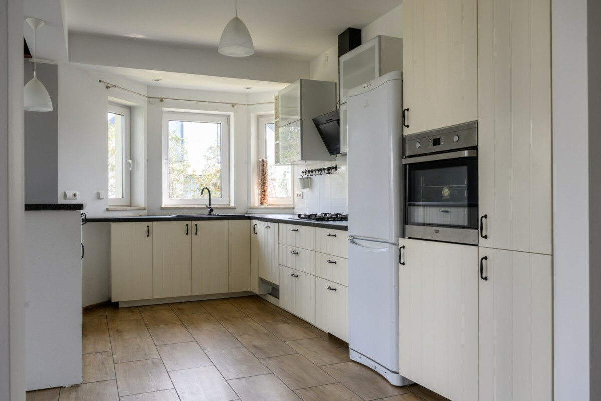 Podłogi: panele w pokojach, gres w łazienkach i kuchni.