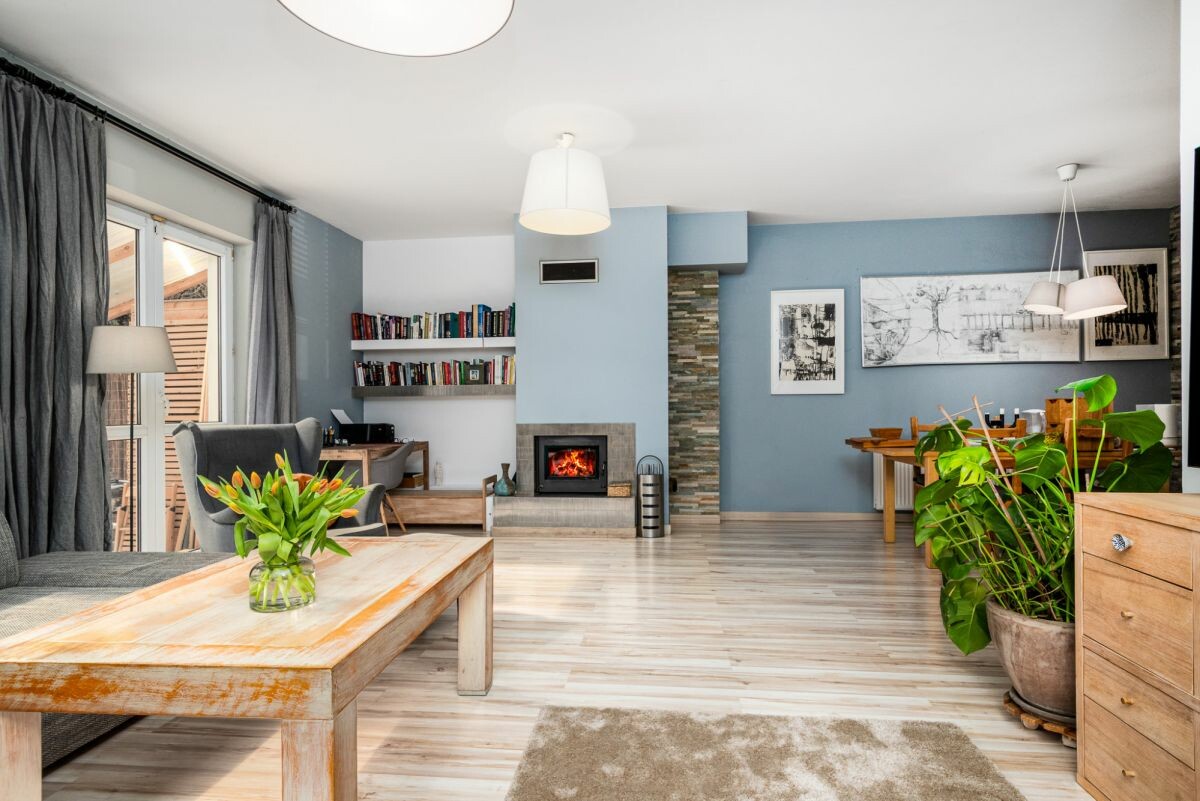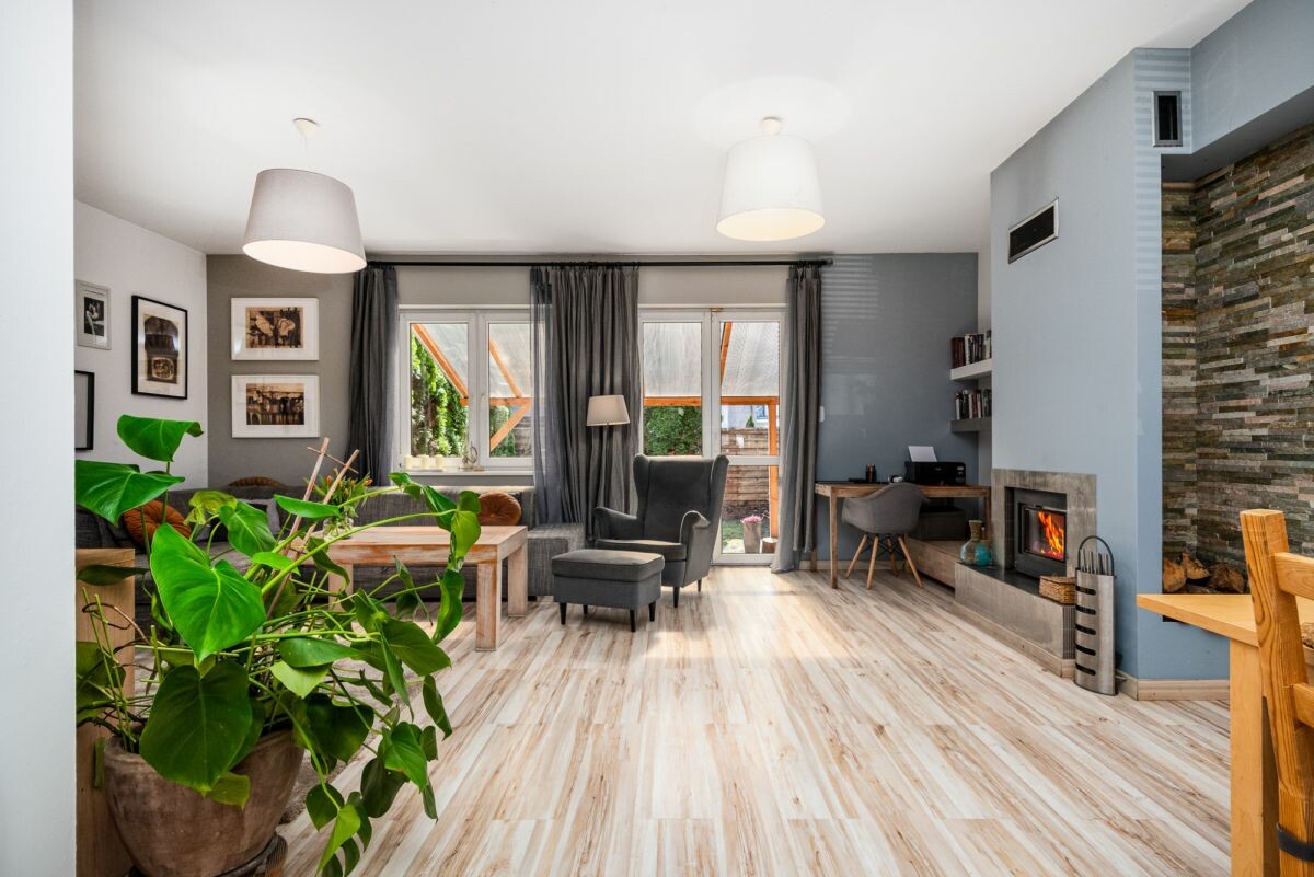 - przestronny salon z kominkiem i wyjściem do ogrodu